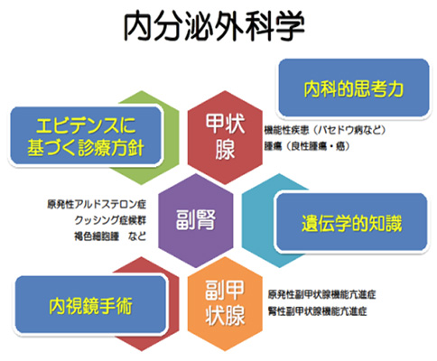 内分泌外科学は甲状腺、副甲状腺、副腎といった内分泌臓器の疾患を臓器横断的に取扱います。様々な機能性疾患や腫瘍性疾患があり、その診断と治療にはきわめて高い専門性が要求されます。内分泌外科専門医は外科専門医を基盤とするサブスペシャリティとして、日本外科学会および専門医機構から正式に認められています。